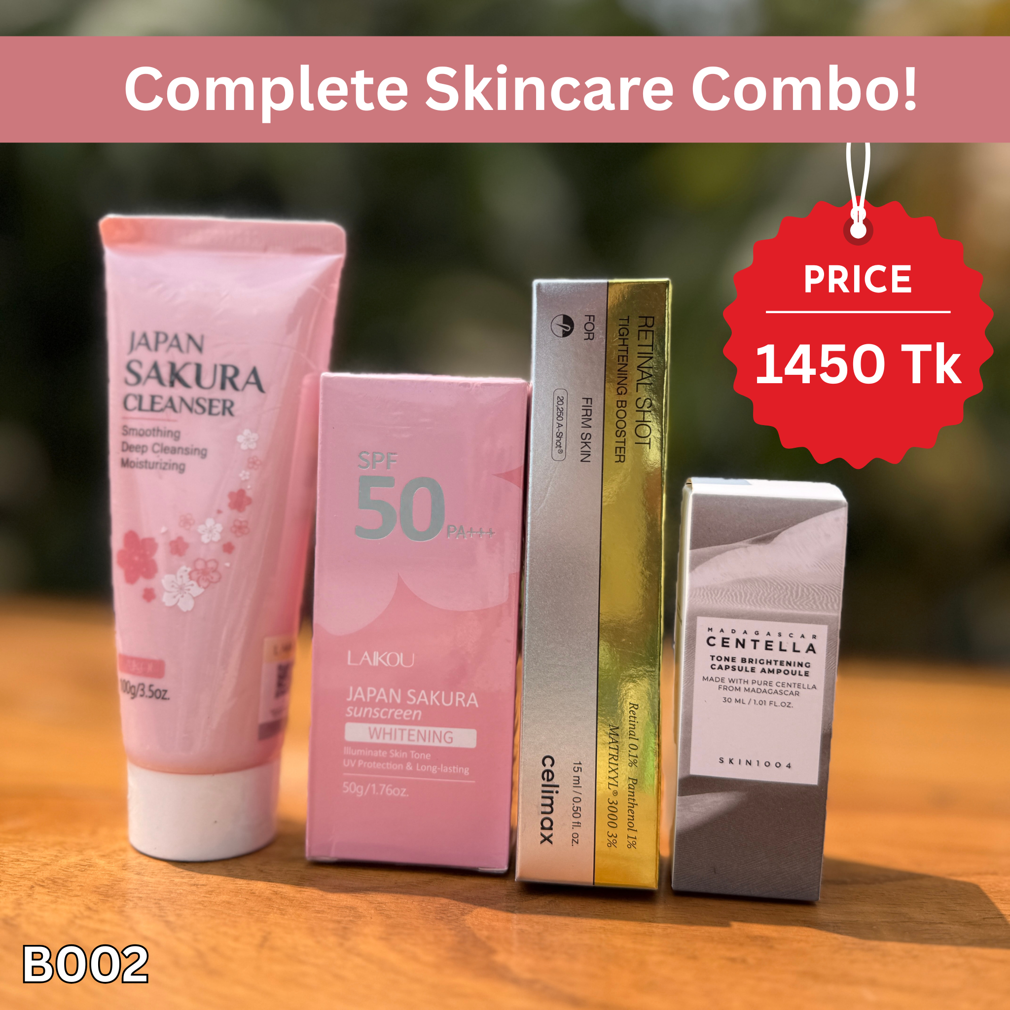 এই কম্বোতে রয়েছে Japan Sakura Cleanser, SPF 50 Sunscreen, Celimax Retinal Shot Tightening Booster এবং SKIN1004 Tone Brightening Capsule Ampoule—যা ত্বক পরিষ্কার রাখা, রোদ থেকে সুরক্ষা, স্কিন ব্রাইট করা এবং টানটান রাখতে সহায়তা করে। নিয়মিত ব্যবহারে ত্বক থাকে ফ্রেশ, স্মুথ, উজ্জ্বল ও healthy looking। 🌸💖